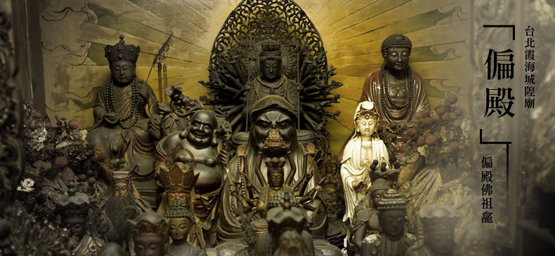 霞海城隍廟偏殿佛祖龕主祀牽手千眼觀音,同祀達摩祖師等諸神,前方奉有文、武判官大型神像。
